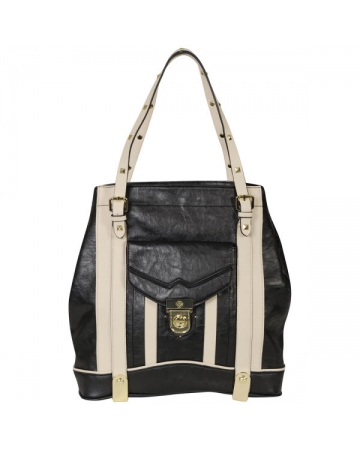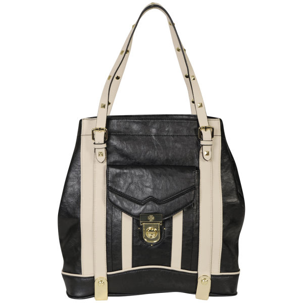 Featuring a front pocket with a functional metal fastening, black and cream leather upper, studded detail to straps, front pocket with logo embossed metal fastening and purple cotton lined inner.
