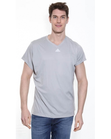 Adidas Clima Cool jersey style, v neck t-shirt in a light grey colour with a white Adidas logo on the chest.