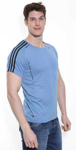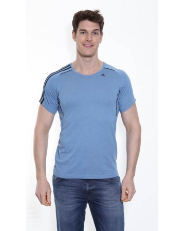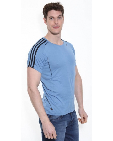 Adidas Jersey Style T-Shirt in light blue. T Shirt features black stripes on the sleeves and a black trim under the arms.