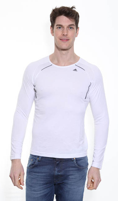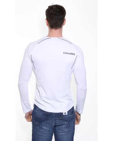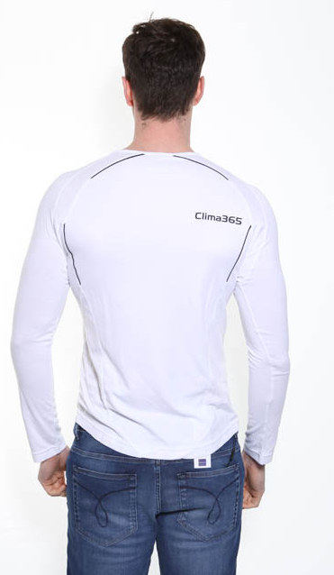 White Adidas long sleeve t-shirt with black trim, Adidas logo embroidered on the chest and Clima365 print on the back.