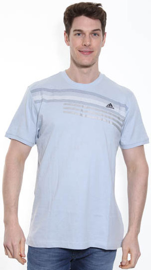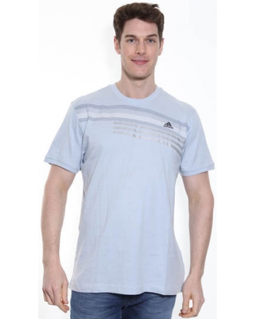 A pale grey/blue Adidas t-shirt with round neckline, a black Adidas Logo print on the chest and sparkling silver,black and white stripe design.