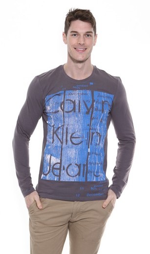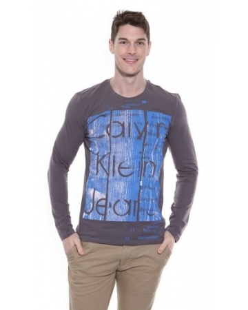 A grey, long sleeved, luxury jersey stretch t-shirt with round neckline and blue print on the front with Calvin Klein logo.