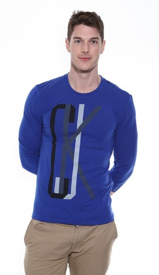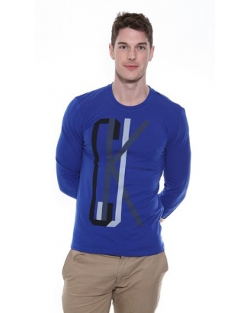 A beautiful blue, long sleeved, luxury jersey stretch t-shirt with round neckline and features large CKJ print on the front in black and grey colours.
