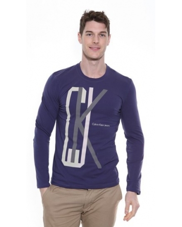 A deep navy blue, long sleeved, luxury jersey stretch t-shirt with round neckline and features large CKJ print on the front in beige and grey shades.