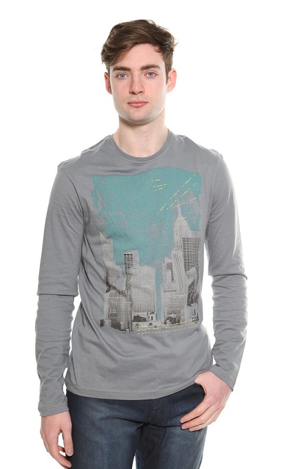 A long sleeved, grey t-shirt with round neckline, a grey, pale mint green and yellow splash abstract street print and "Calvin Klein Jeans" print to one side of the chest.