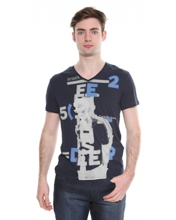 A short sleeve t-shirt in a deep navy colour with a grey and blue abstract print and Calvin Klein Jeans logo printed on one side.