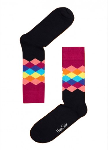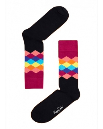 Happy socks for happy feet, these fun diamond print socks are black in colour with shades of pink, blue, and purple in a diamond print and Happy Socks print on the bottom.