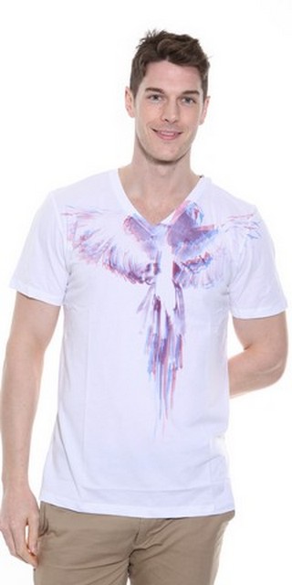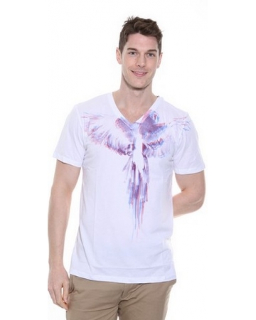 A crisp white t-shirt with flattering v-neck, a blue and red eagle print on the front and Boss Orange in small print on the back just below the neck.