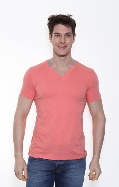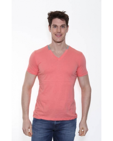 This classic men's v neck short sleeve salmon tshirt features grey collar.