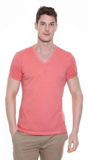 A classic v-neck t-shirt in a peach colour with a bronze effect Boss Orange badge near the hemline. Perfect t-shirt to wear with any colour trousers.
