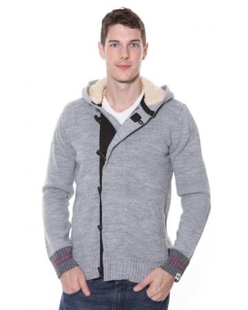Gents Pepe Jeans silver coloured Atkinson long sleeved sweater. The sweater is a slim fit with a lined cream hood there is a hidden zip down the front and there are 5 large aran type buttons to close the sweater.