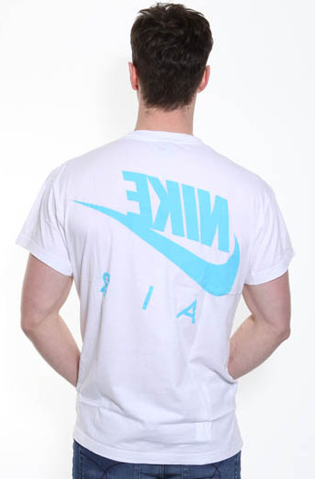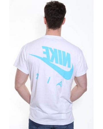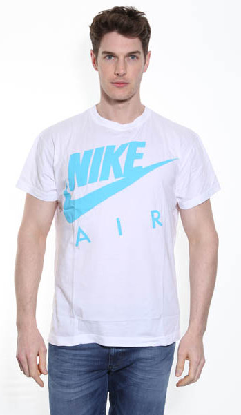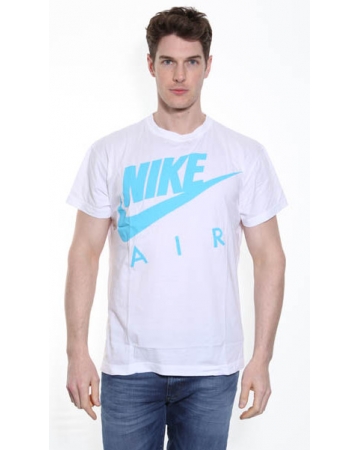 Men's Nike Cotton T-Shirt. A white, round neck, nike t-shirt with aqua blue "Nike Air" large print to the front and back.