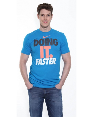 A bright blue, round neck, nike t-shirt with "Doing it Faster" colourful print on the front.