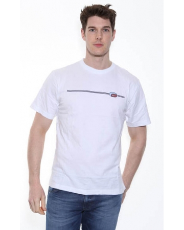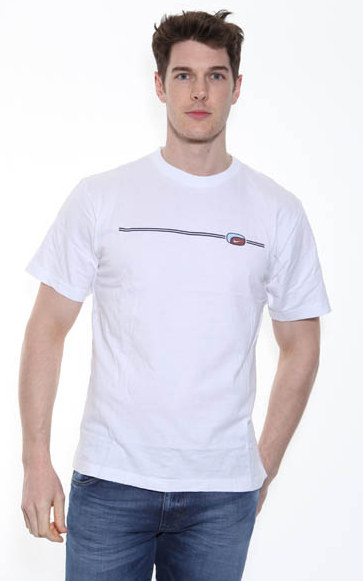 Men's Nike Cotton T-Shirt. A white, round neck, nike t-shirt with two navy lines across the front and blue and maroon small circle print. Also features Nike logo in navy on the rear neckline.