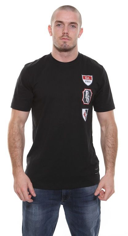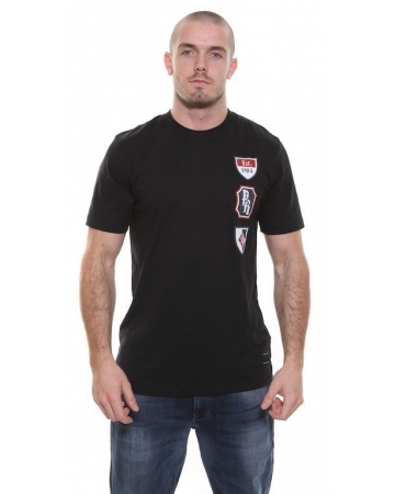 A black, round neck, short sleeve nike t-shirt featuring three crest to the side with "Est 1984" in black trim ,"PR" in red trim and "SB" in black trim. A Nike Stakeboarding Beaverton, Oregon, USA tag sits discreetly on the hemline.