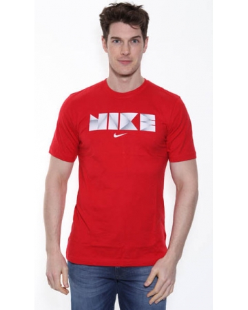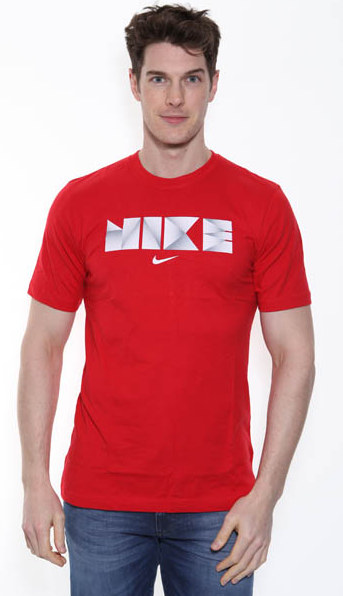 A classic red, round neck nike t-shirt with short sleeves, standard fit and a large grey block Nike logo across the chest.
