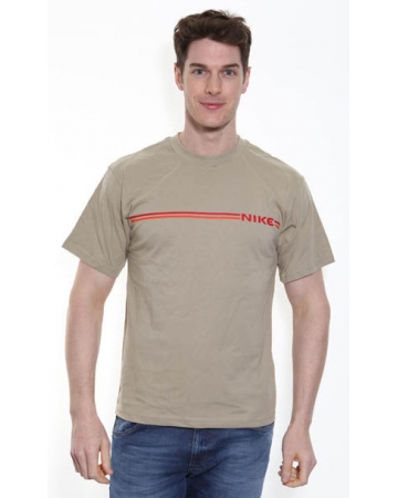 Men's Nike Cotton T-Shirt. A khaki green, round neck, short sleeved nike t-shirt with red, orange stripe and red "Nike"print on the front.