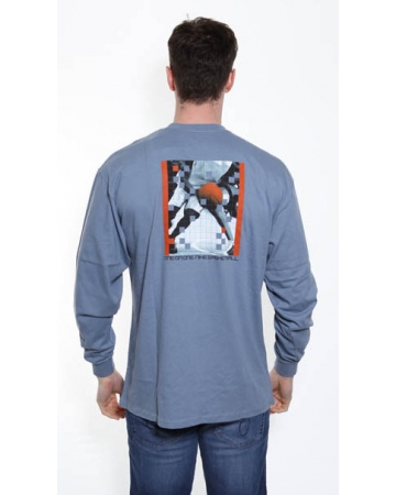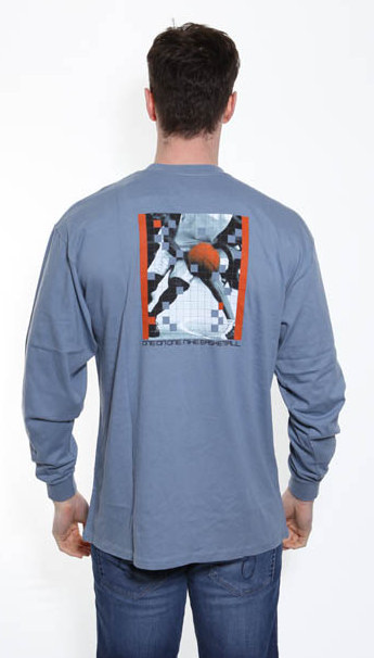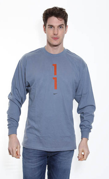 A blue/grey Nike t-shirt with orange number "1" print on the front and a basketball game scene to the back.