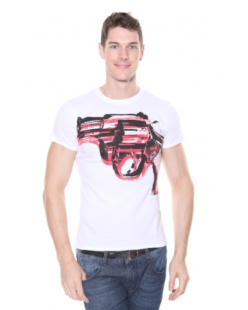 Featuring a hand drawn like hand gun, this stylish statement piece is one to be admired. With its contrasting black and red print against a white base, this stylish shirt is sure to impress.