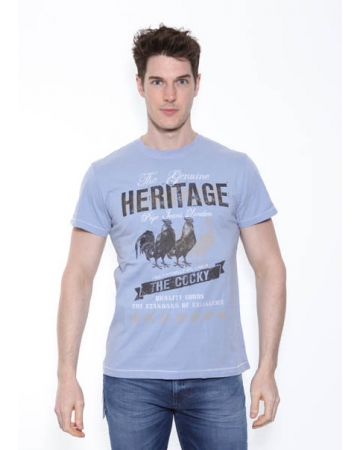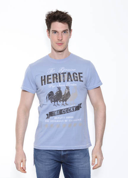 Pepe Jeans Hertiage t-shirt in a grey/blue colour with two cocks printed on the front and "Quality Goods The Standard Of Excellence" printed underneath.