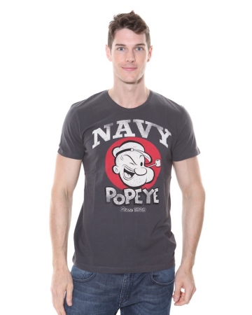 Popeye Cartoon Short Sleeved T Shirt. Dark grey t-shirt with a faded Popeye cartoon image and "Navy Popeye" print.