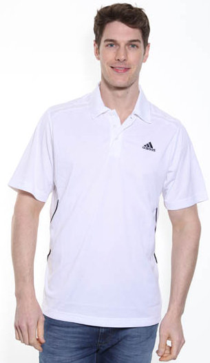 White Adidas, jersey style t-shirt with button up front, white mesh collar,shoulders and matching underarm panel with navy trim and navy Adidas stitch logo.