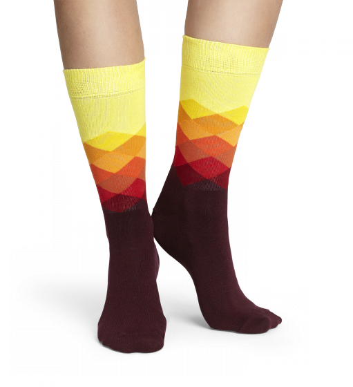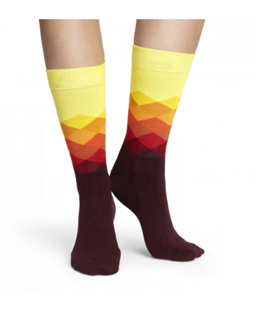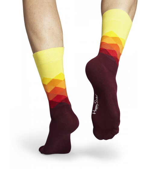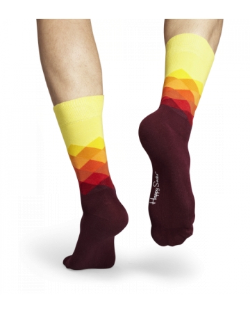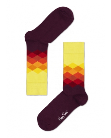 Happy socks for happy feet, these fun diamond print socks are wine in colour with shades of red, peach, orange and yellow in a diamond print and Happy Socks print on the bottom.