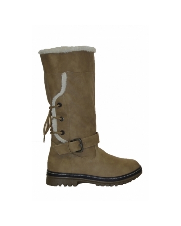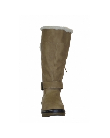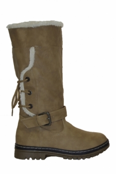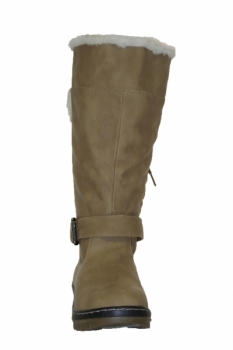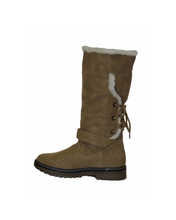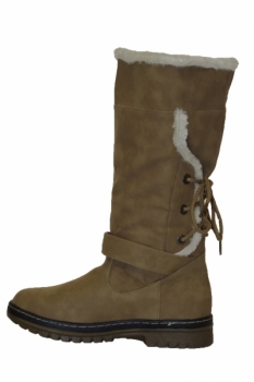 Faux leather, camel boots with cosy faux fur lining, strap with buckle across the front and lace detail to the back. These boots are easy to slip on and off, have brilliant sole grips and sit up to your calf.