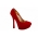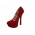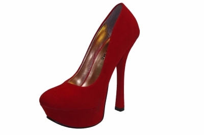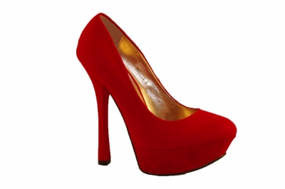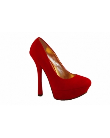 Red faux suede, platform shoe featuring a 6" high heel, and has a smart rounded toe.