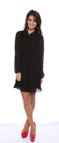 Smart collar, flattering chiffon sleeves, buttons and lace detail on the chest and a pretty pleated, short flowing skirt. Elasticated waistline which is very flattering.