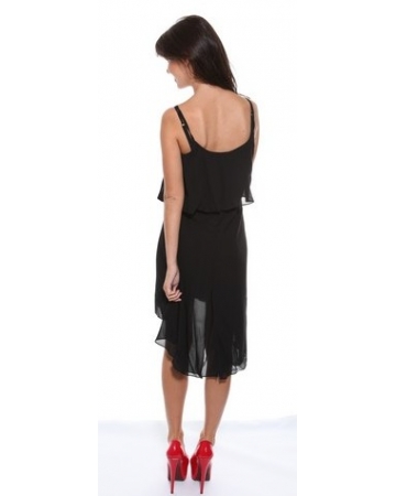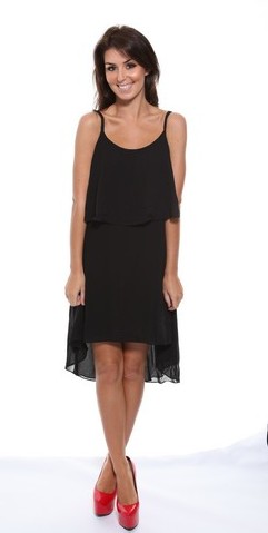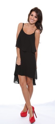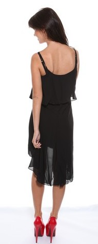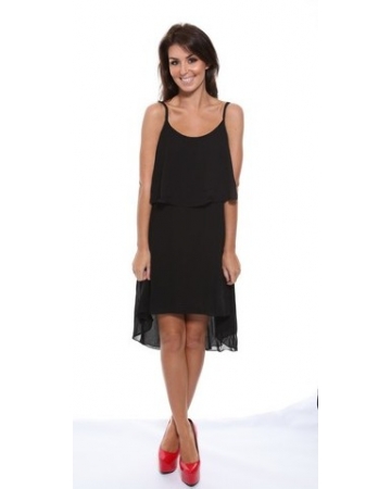 Stunning black dress featuring floating tiers and a scoop neckline. The spaghetti straps are balanced by a short lowered back, A-line skirt and the bold black hue makes the perfect backdrop for any accessory.