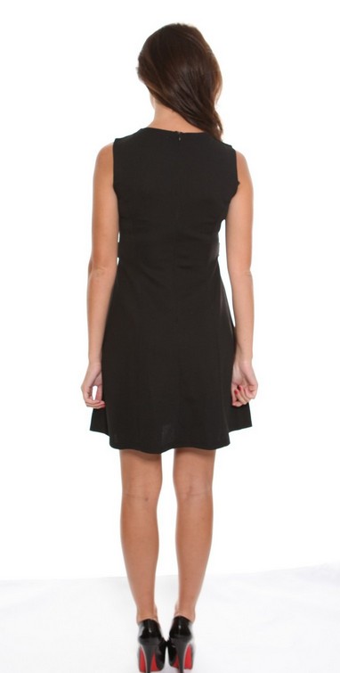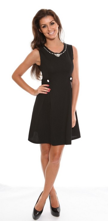 Bring the 50's idea to a modern and chic time in this Woven Black Dress. With stylish touches such as a pearl detail around the neckline, large buttons and a fitted waistline to flatter your curves.