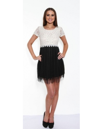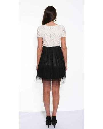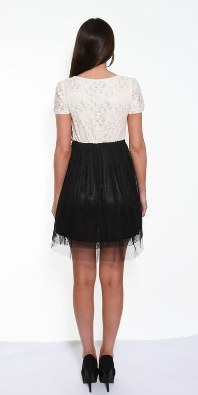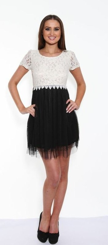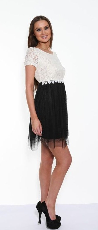 Add a little style to your day with this black and cream two tone dress by Angel Eye London. This chic dress features a cream floral lace top with flattering round neckline and short sleeves and a contrasting black, flowing polka dot lace skirt.