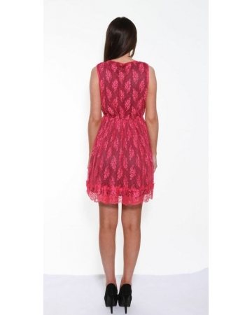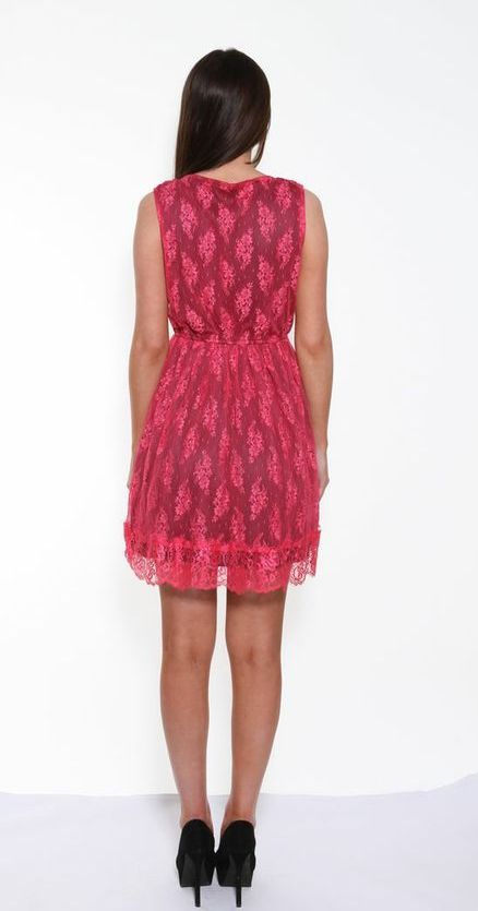 Stunning fuchsia, floral lace dress with black lining. Perfect sleeveless party dress with a feminine round neckline and gathered elastic waistline which is very flattering to all shapes.