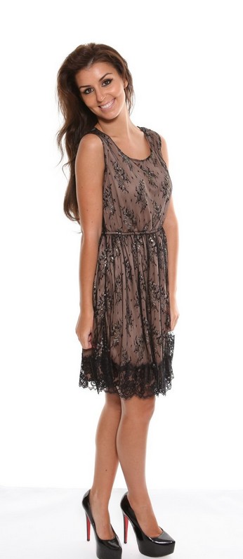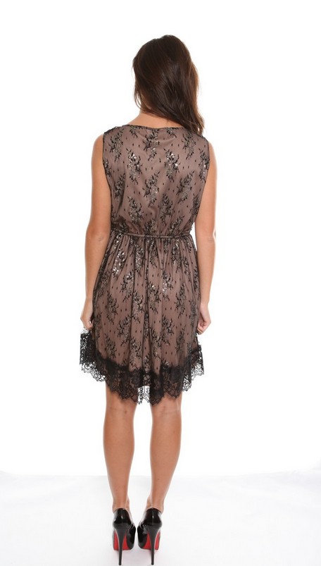 Stunning fawn dress with black lace and sparkling gold/silver detail. This perfect party season dress features a feminine round neckline and sleeves are edged with a fine binding.