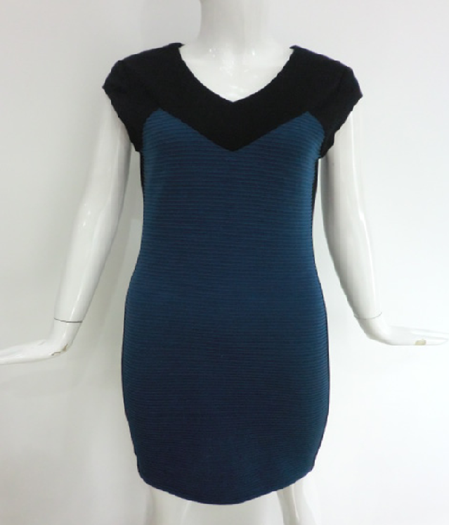 A stunning ensemble of elegance and class, this dress features a black broad band V-shaped neck, with petite cap sleeves. The seersucker ribbed effect front panel, presents in a striking midnight blue and the back reveals in plain black, with long centre zip and darts thus streamlining the back panels.