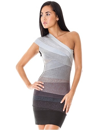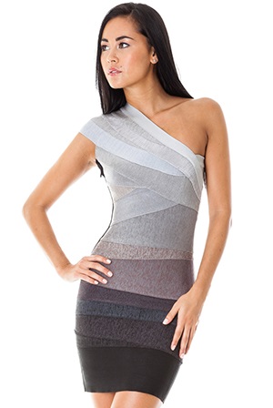 A very stylish, body hugging, elasticated dress with varying shades of grey with the bottom of the dress finished in black.