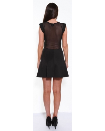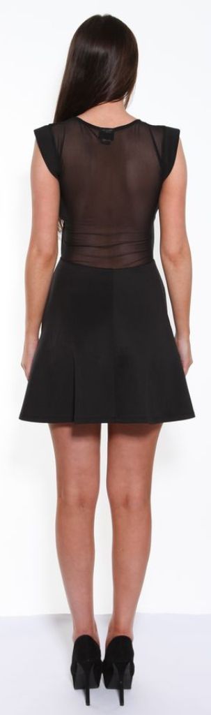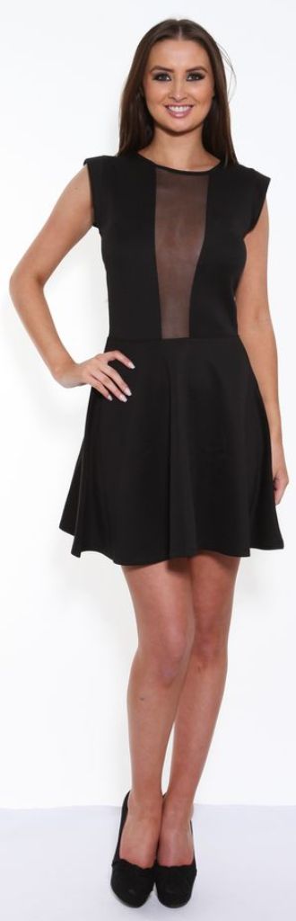 Classic black a-line, sleeveless dress with plunging black mesh neckline and full mesh back. Stand out in this great party dress which suits most figure types with its flattering a-line shape.