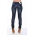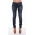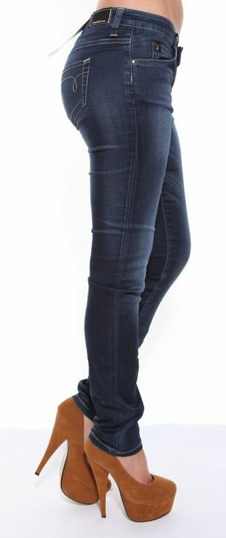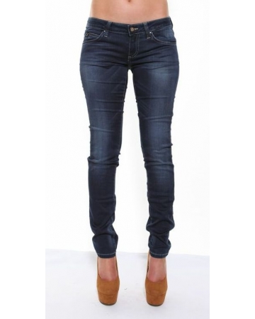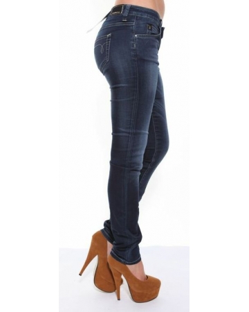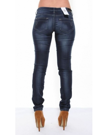 A trendy vintage dark stonewash with five pockets, stitch design on the back pockets, button and zip closure and a black "Calvin Klein Jeans" logo patch with gold trim situated on the back waistband.