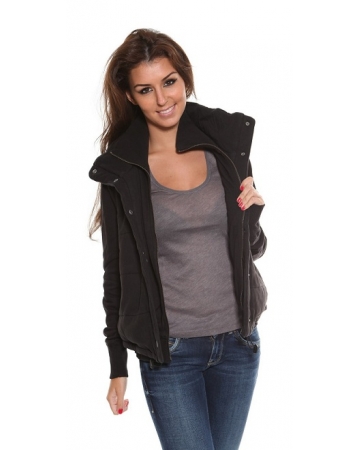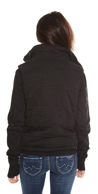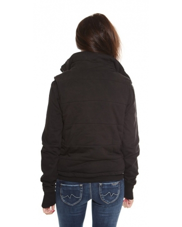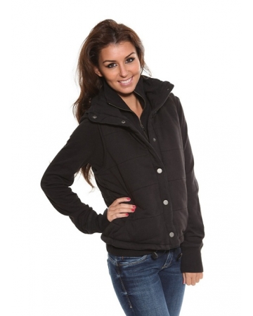 A black, soft padded cotton jacket with zip up closure that is hidden by a button closure. The buttons are a silver colour and have Calvin Klein logo on each. Also features a high collar that can be worn up or down, elasticated string ties at the bottom and ribbed hem, cuffs and collar.