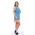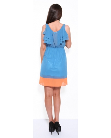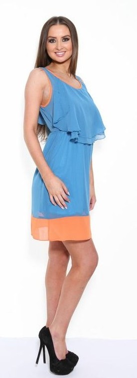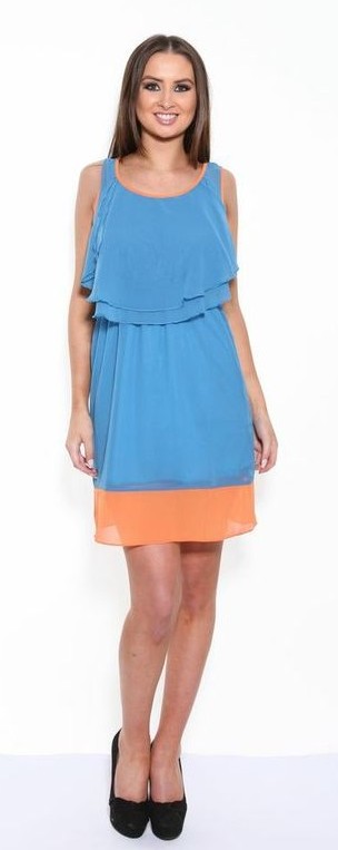 A faux chiffon, sleeveless, blue dress with contrasting orange trim around the neckline, arms and hemline. Also features a feminine layered detail on the back of the shoulders and on the chest and has an elasticated waistband for a flattering shape. The skirt of this dress is fully lined.