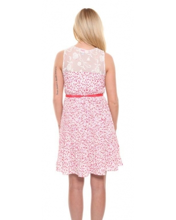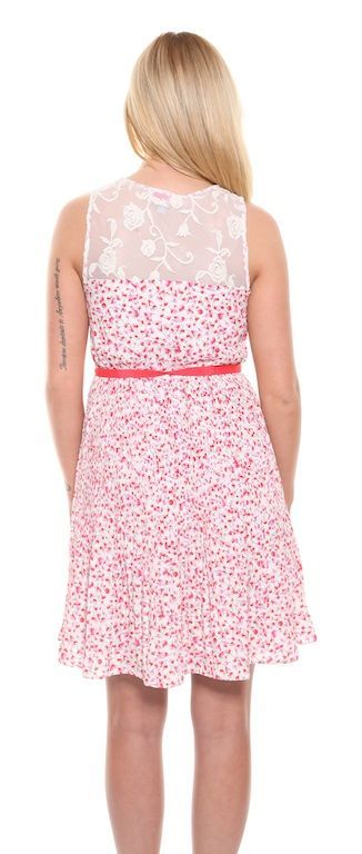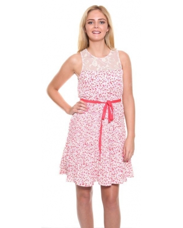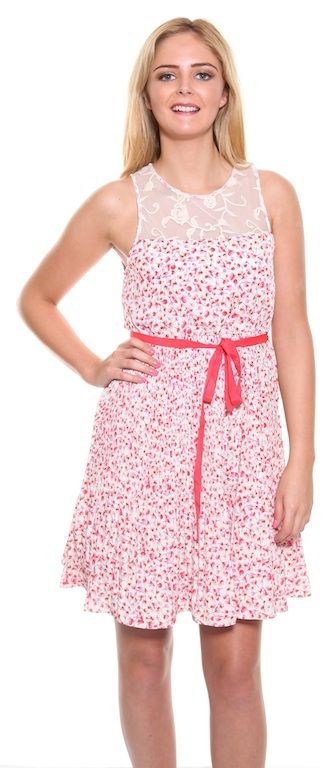 A very pretty, white dress with beautiful pink, red and grey floral print, delicate flowing pleats and cream floral lace on the top. A light sleeveless dress with fully lined skirt and ribbon belt to accentuate the waist. The perfect little Spring/Summer dress.