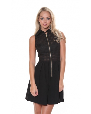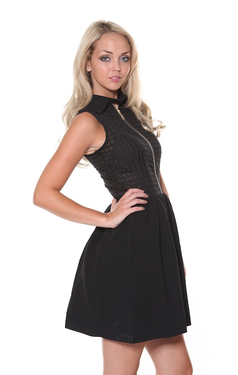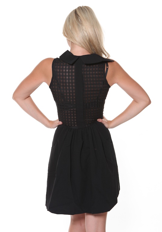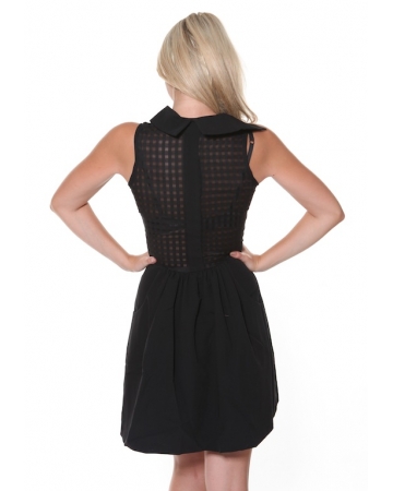 This cute fitted black sleeveless dress features a high neck collar, flirty sheer gingham top and skater style block black skirt. The skirt is fully lined and also features side pockets.