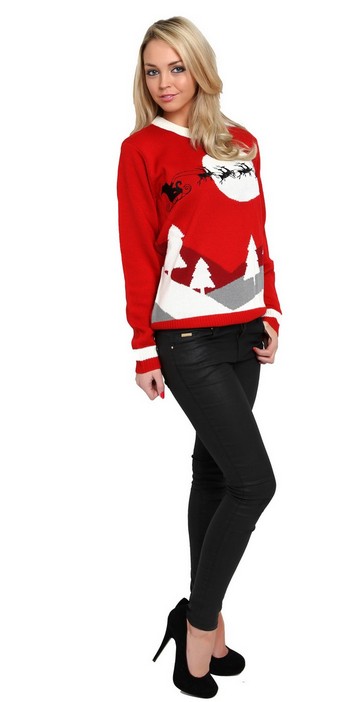 Ladies Red Christmas Jumper featuring Santa in sleigh with reindeers in the night sky. The sleeves have a white strip to finish off the jumper.