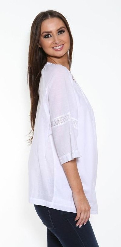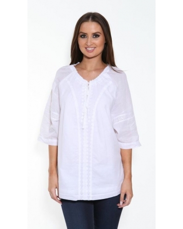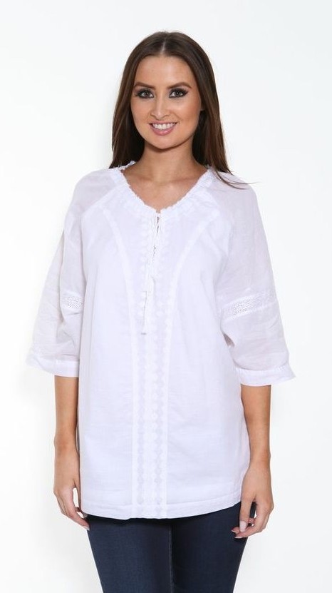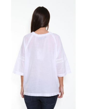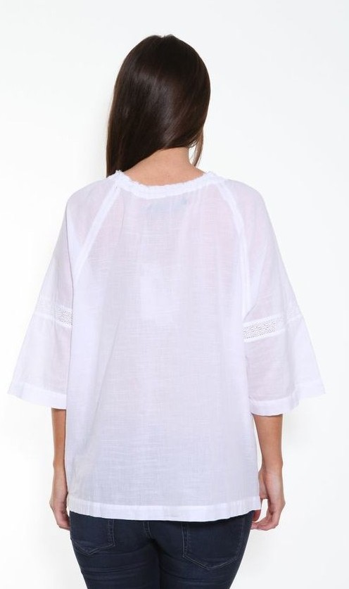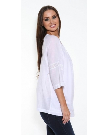 A soft, lighweight, white cotton top with flattering V neckline with crochet detailing and string tie. Over sized fitting top with large short sleeves with crochet detail and a silver Calvin Klein badge on the hemline.
