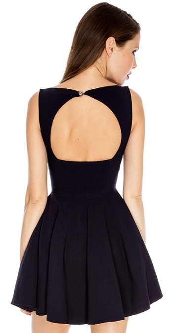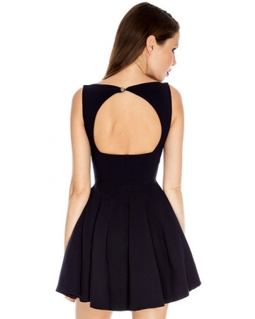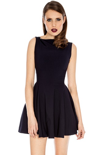 Highly fashionable deep navy skater dress with origami fold neckline and the skater shape skirt. This design can be very flattering on all shapes. The back of the dress sports a sexy cut out design with a button detail closing at the neck.