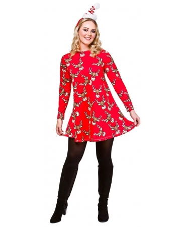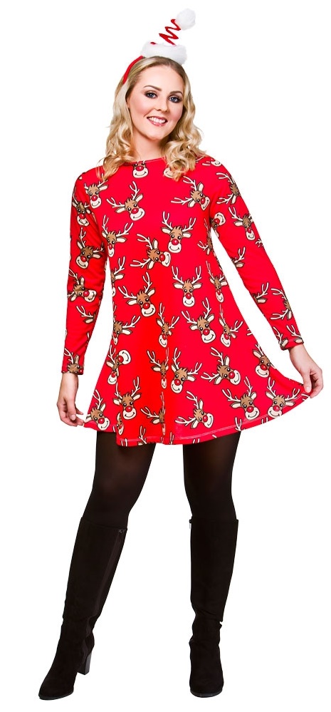 Red long sleeved Christmas dress with printed reindeers.