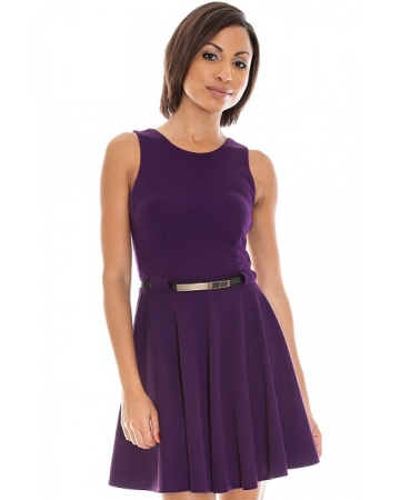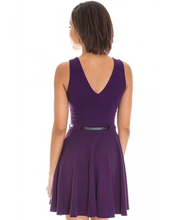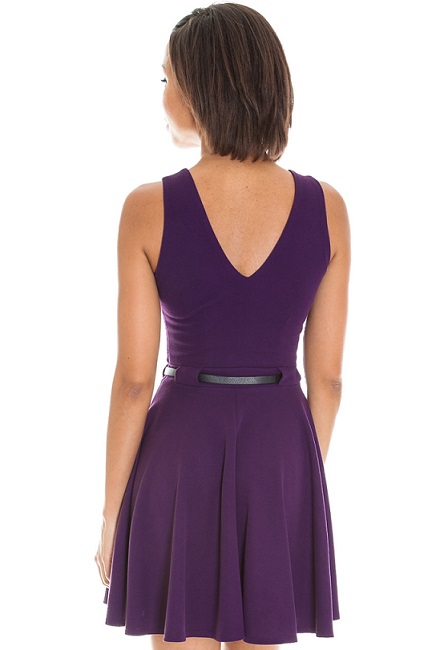 Stylish, deep purple, sleeveless, skater dress with contrasting belt to enhance the waistline and feminine v shape neckline to the back.