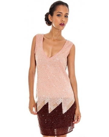 A loose shift dress crafted in a lightweight chiffon fabric with long beads and small sequin embellished. Flattering V neckline and sleeveless styling and high boat neckline on reverse.