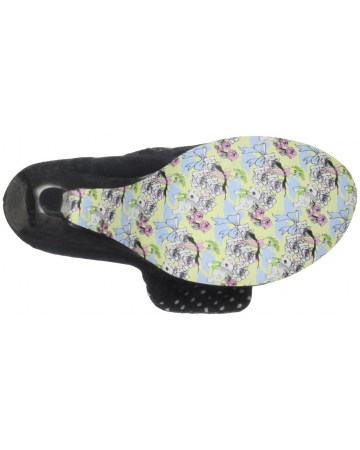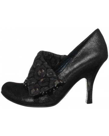 This charming metallic black baby doll trend shoe is presented with contrasting fabric folded over at the instep, with velvet buttons to the side revealling spat detail. This shoe also features a mottled metallic black heel.
